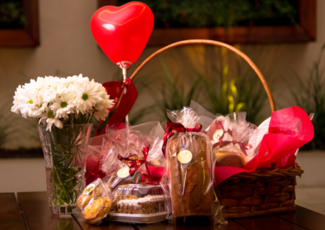 São três tamanhos de cestas e as entregas feitas das 7 às 10h – a taxa de entrega depende do bairro. A pequena vem com pão de mel, broinha aerosa, petit four doce, minipão óliver, pão de queijo, minissonho, suco de fruta integral e flor. Custa R$102.