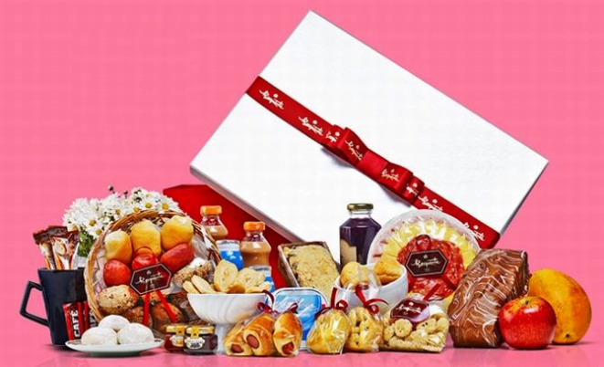 A média é composta de pão funcional, pão de minuto, petit pan integral, minipão girassol, minipão de legumes, minitortinha de maçã, pão de queijo, bolo de banana, biscoito samantinha, frutas, queijo processado, suco de fruta integral, iogurte, minigeleia, tábua de frios, sachês de chás, sachê de granola, flor e caneca. Custa R$195.
