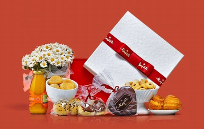 A aposta é a cesta em formato de bandeja. Esse modelo custa cerca de R$135, e o conteúdo é montado como quiser. Para compor a cesta, cada pão-de-mel e alfajor sai por R$6. O doce beijinho da mamãe e os minibolos em geral custam a partir de R$6,50. Já as caixinhas com 6 trufas custam R$25.