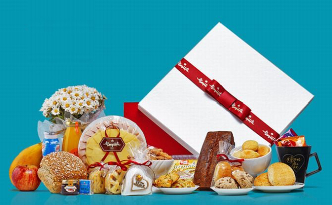 Já a cesta grande vem com cestinhas de pães especiais, minidoguinho recheado, pão de queijo, bolo mármore, cuque de goiabada, petit four doce, minissonho, biscoito palmier, tortinha de banana, sachês de capuccino e café com leite, achocolatado, iogurte, minigeleia, suco de fruta integral, requeijão cremoso, tabuinha de frios, frutas, flor e caneca. Custa R$285.