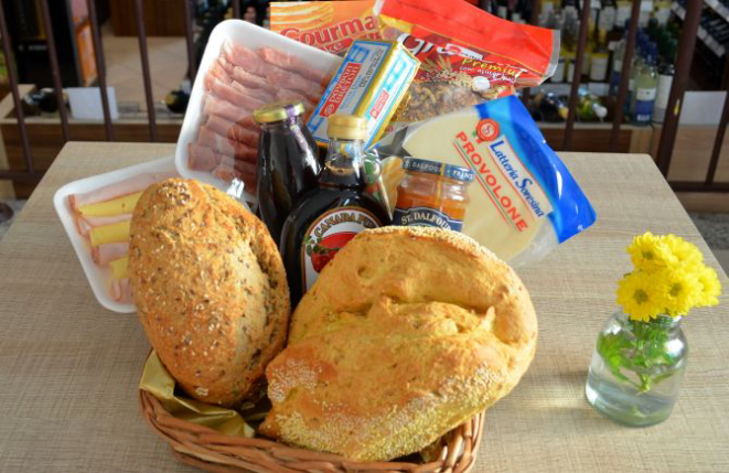 Já a cesta Ternura é composta de: bolo de nozes, bolo inglês com uvas passas, cacho de uva, caneca decorativa, goiabinha, leite integral (200ml), minipão brioche, minipão de ervas finas, minipão de leite, minipão de linhaça, palito de queijo, palmier, rocambito de ricota, suco (300ml), cereal e tábua de frios. Custa R$180.