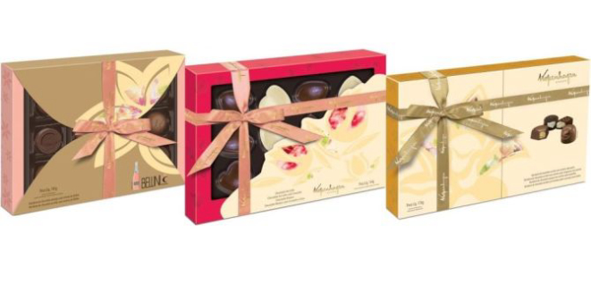 São três caixas de chocolate Kopenhagen em tons pastel. A Flores e Frutas vem com 12 bombons sortidos nos sabores pera, tangerina com jasmim, baunilha, e morango com violeta (R$ 48,20). A caixa Bellini (R$ 54,90), que une o chocolate e o prosecco de pêssego branco, foi criada em parceria com a marca italiana Bellini. A embalagem vem com seis bombons cobertos de chocolate ao leite com recheio cremoso de Bellini, e outros seis bombons com cobertura de chocolate amargo e recheio licoroso de Bellini. Já a Minicorações (R$ 38) vem com bombons em formato de coração, nos sabores: chocolates ao leite, chocolate branco, chocolate ao leite com crocante de castanha de caju, e chocolate branco com crocante de castanha de caju e coco.