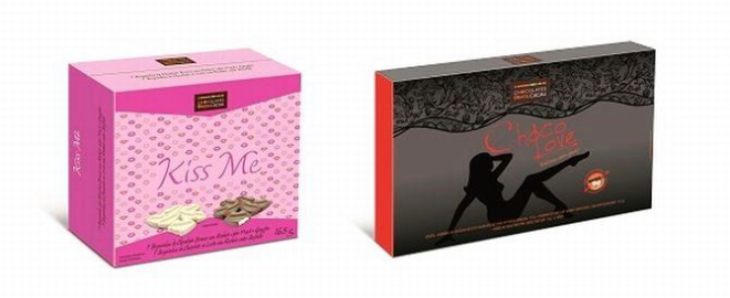 São três sugestões para dar de presente. O tablete surpresa, de chocolate ao leite com embalagem romântica custa R$ 9,90 e tem 100g. A caixa Kiss Me vem com 14 bombons em formato de boca, sete no sabor chocolate ao leite com recheio de beijinho e sete bombons de chocolate branco com recheio sabor maçã e gengibre, que tem efeito esquenta a boca. O produto tem 165g e custa R$ 27,50. Já a caixa Chocolove tem 165g, vem com cinco bombons de chocolate ao leite com recheio de geléia de pimenta e cinco de chocolate amargo com recheio refrescante. Também vem como uma caneta com calda comestível de chocolate e um par de dados eróticos. Custa R$ 38,50.