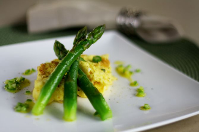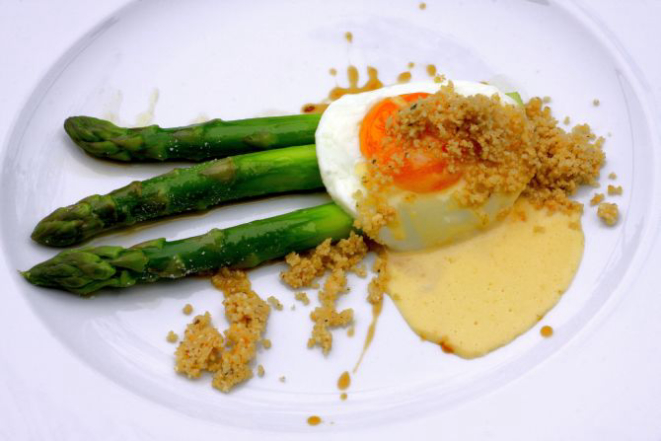 “O prato aspargos frescos com ovo caipira, molho holandês e farofa de avelã é dedicado ao nosso brunch no restaurante. Uma combinação clássica entre aspargos frescos com ovos, que dão leveza, suavidade e frescor ao prato.”