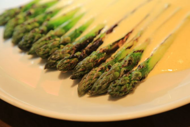“Fiz o clássico francês aspargos com molho bérnaise. Nessa receita ele foi feito na brasa e acompanhado com o perfumado e cremoso molho. O prato combina muito como acompanhamento de peixes, lagosta ,camarões ou pode ser saboreado sozinho.”