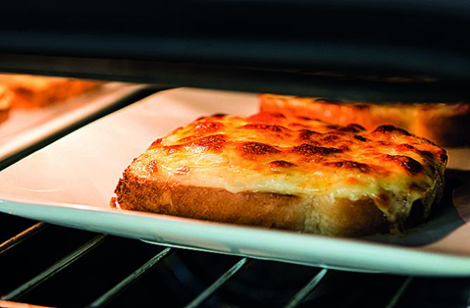4. Asse as duas fatias uma ao lado da outra em forno pré-aquecido a 180 graus C com o grill ligado em 200 graus C até o queijo borbulhar e gratinar.