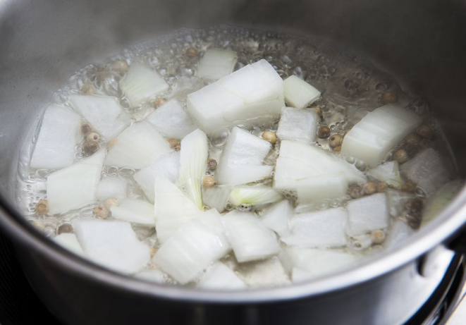 Comece pela redução de vinho. Em uma panela, leve ao fogo o vinho, o vinagre, a cebola e os grãos de pimenta e deixe a mistura ferver até que o volume reduza pela metade. Pode parecer muito pouco, mas é o suficiente para equilibrar a acidez e dar mais sabor ao molho. Aproveite para derreter e clarificar a manteiga, retirando a espuma que se forma na superfície. É importante que a manteiga e a redução fiquem em temperatura ambiente para permanecerem aquecidas. O cuidado com a temperatura dos ingredientes é uma das principais dicas da chef Bianca. Toste levemente as fatias de pão, frite as tiras de bacon e deixe os demais acompanhamentos prontos.