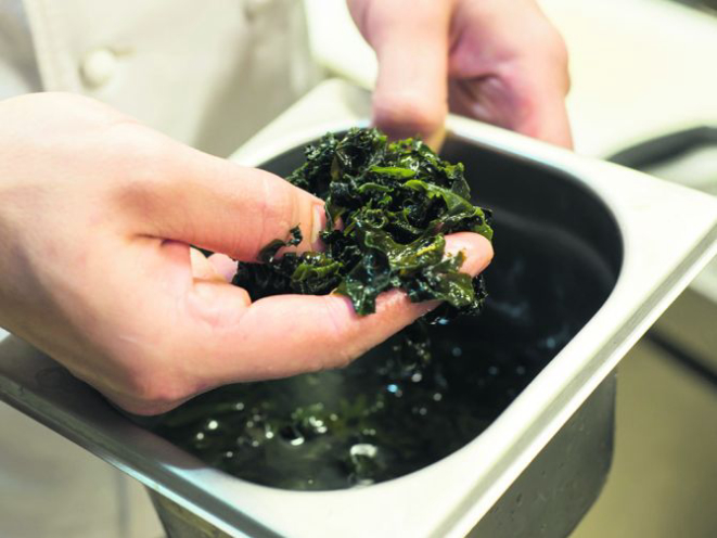 Hidrate a alga por aproximadamente 3 minutos em água. Não deixe mais do que isso senão a alga ficará muito mole. Após peneirar, adicione a água ao caldo de frango para dar um sabor extra no preparo. Reserve as algas.