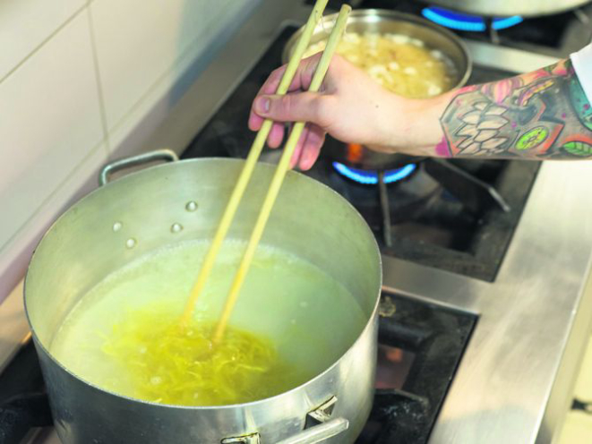 “O segredo é fazer um bom caldo a partir da carcaça de frango, partes que são ricas em colágeno e que vão dar densidade e sabor concentrado”, explica o chef. As melhores peças de carne suína para lámen são copa lombo, lombo, paleta desossada ou barriga.