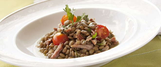 Salada de Lentilhas - Nesse preparo, a lentilha é base para uma salada substanciosa. Vai fria à mesa junto com lombo de porco desfiado, tomatinhos cereja e folhas de manjericão. A cebola roxa traz a crocância e o molho vinagrete a acidez necessária ao prato. Uma opção leve e fresca para ceias servidas nas noites de verão.