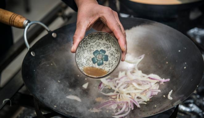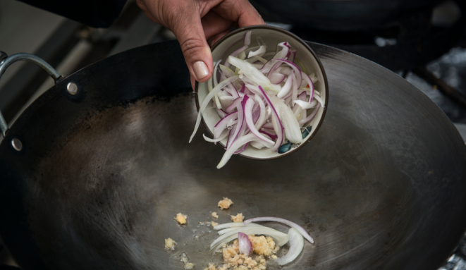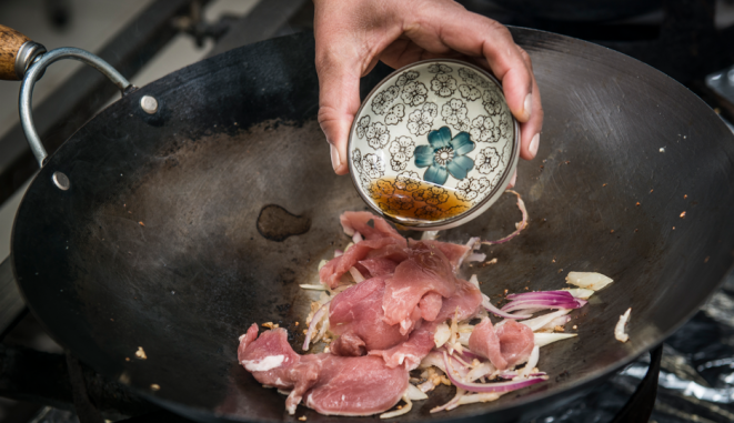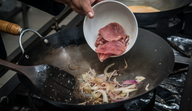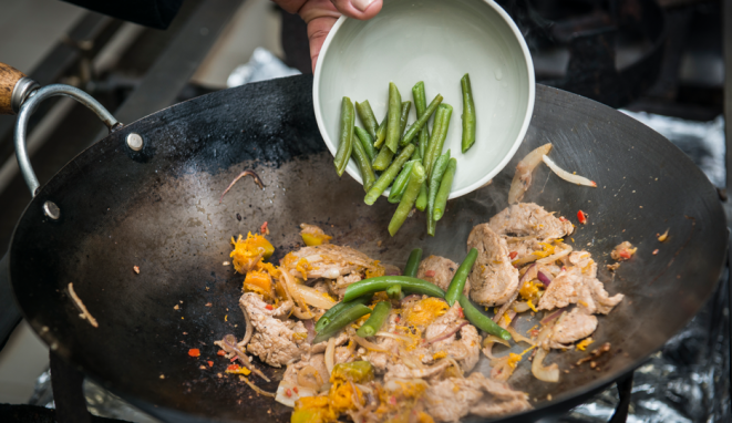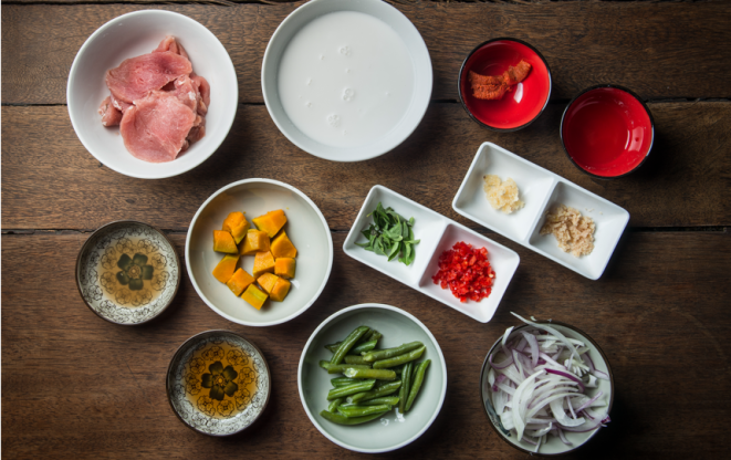 Para o prato escolhido neste passo a passo, o curry selecionado é o vermelho, que acompanha tiras de filé mignon suíno. Para temperar, alho, pimenta e gengibre, que potencializam a picância do curry. No lugar do sal comum, o nam pla, conhecido como sal tailandês, feito à base de peixe. Com esses ingredientes-chave, é possível fazer um prato extremamente saboroso e, o melhor, de forma simples, usando apenas uma panela, desde que os vegetais — a abóbora e a vagem — já estejam pré-cozidos.