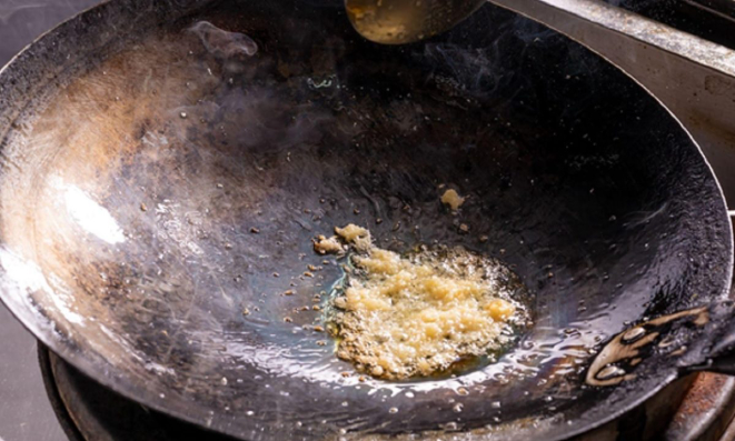 1) Adicione o óleo de gergelim à wok e frite o gengibre ralado por poucos minutos;