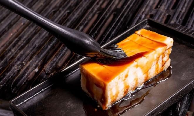 1) Pincele com molho teriyaki e corte a panceta;