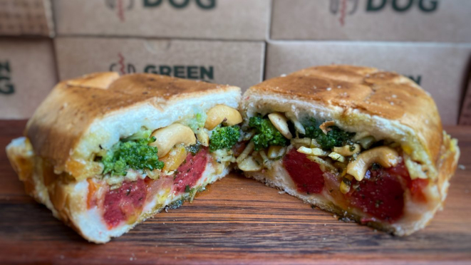 - Salsicha vegana (no Green Dog, a salsicha é artesanal e leva um blend de feijão argentino, cenoura, beterraba, linhaça, aveia e salsa);