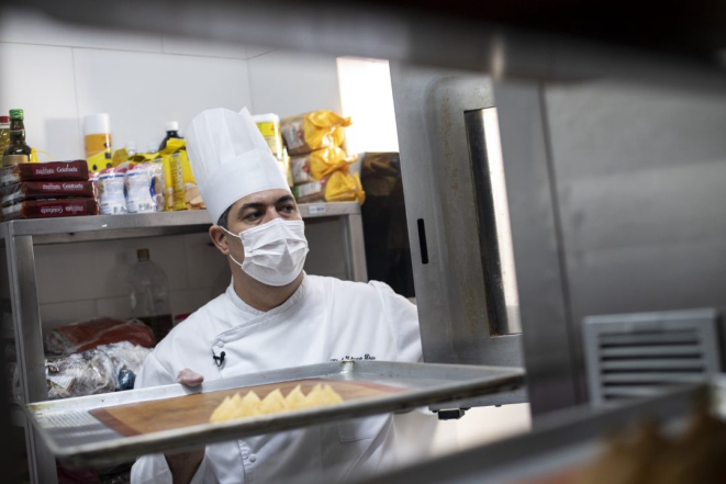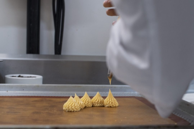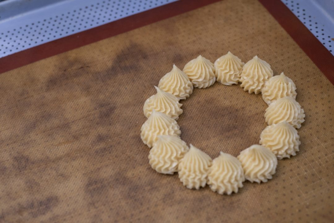 “Nos ingredientes líquidos, coloco metades iguais de água e leite”, diz. Depois de pronta, a massa tem que chegar ao ponto de pingar em picos na assadeira. É nessa etapa que a guirlanda é desenhada, com a união das carolinas, uma a uma.