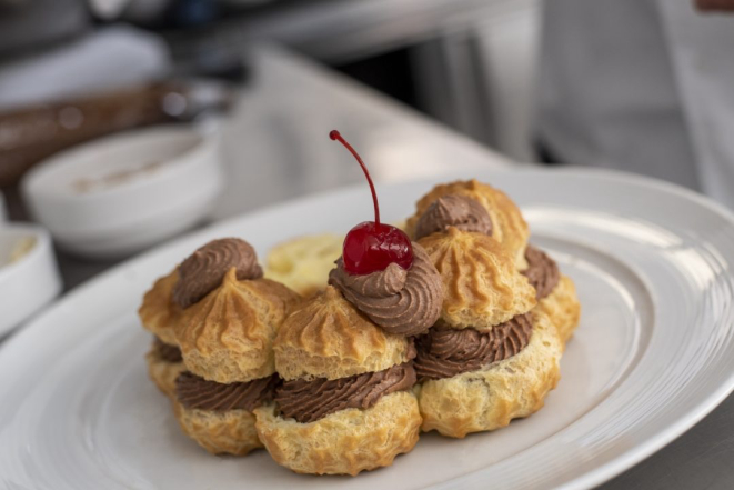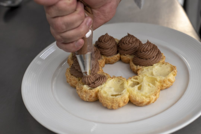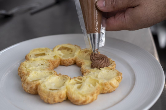 Nesta receita, Juliano ensina a rechear a guirlanda de massa choux com creme de chocolate, mas o sabor neutro do preparo aceita os mais variados recheios. “Caso prefira, a pessoa pode colocar creme de baunilha, doce de leite ou mousse de doce de leite, frutas vermelhas, castanhas. O que a imaginação permitir”, ensina.