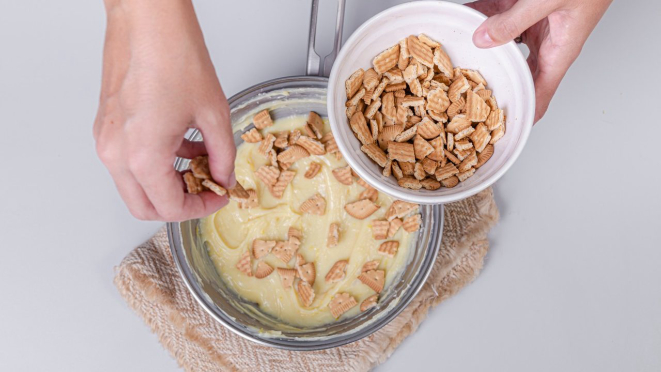 4. Em seguida, acrescente a bolacha maisena picada grosseiramente e misture no brigadeiro.