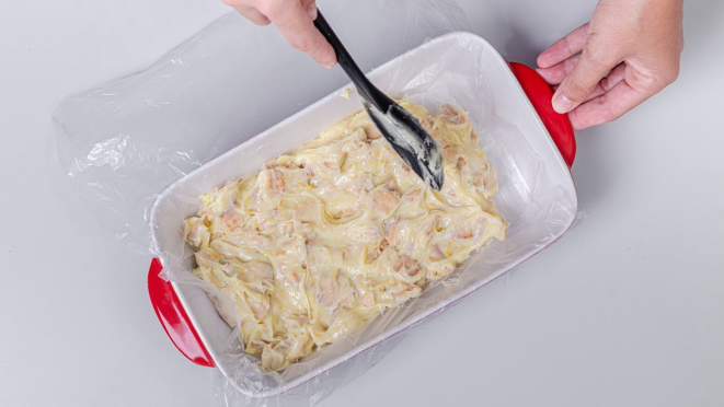 5. Coloque um plástico na bancada, ou em uma forma com tamanho 10 cm x 20 cm. Depois, coloque a massa e espalhe. Cubra com plástico e tente modelar em formato retangular. Após esse passo, leve à geladeira por 4 horas. Quanto mais tempo a palha italiana descansar, mais apurado fica o sabor.