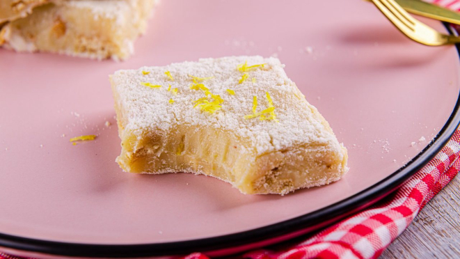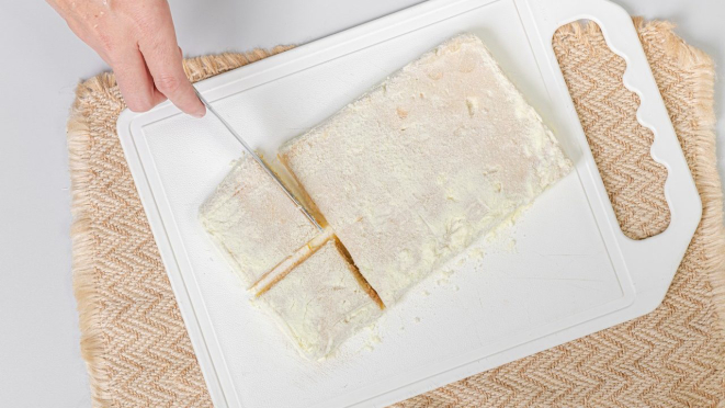 6. Por último, basta polvilhar o leite em pó e cortar em quadrados.