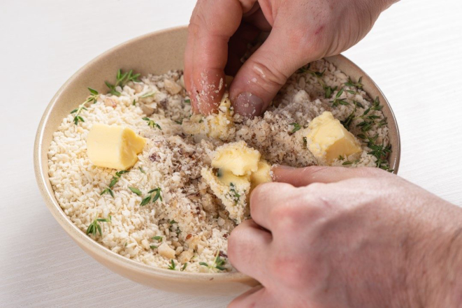 2- Para fazer a crosta, triture grosseiramente as castanhas no processador e misture. Adicione uma pitada de sal, as folhas de tomilho e a farinha panko, até ficar homogêneo.