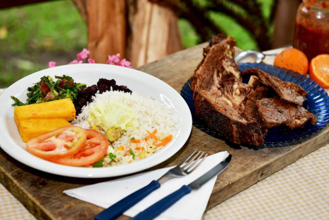 Rosa Brasil: Costela Fogo de Chão, com arroz carreteiro, feijão tropeiro, abóbora e farofa, servidos no fogão a lenha. Buffet de saladas e sobremesas.