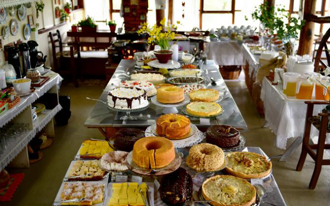 É possível comer também pratos com galinha caipirinha, costela fogo de chão, pierogui frito, hamburguer, cachorro-quente, alcatra na chapa, tilápia e ceviche. Para quem quer aproveitar e curtir um típico café da tarde, com mesa farta e muitas possibilidades entre salgados e doces, deva escolher o Café Colonial da Bisa, que oferece 60 itens, entre cuques, ovos mexidos, canja e bolos tradicionais caseiros.
