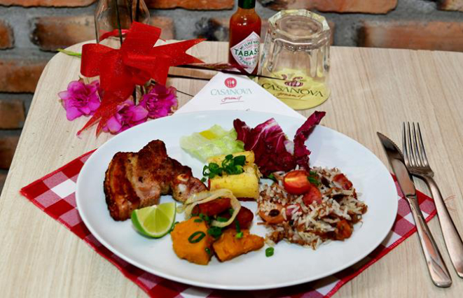 Casa Nova Gourmet: buffet livre com barreado, arroz carreteiro, feijão tropeiro e costelinha suína a pururuca, saladas e acompanhamentos.