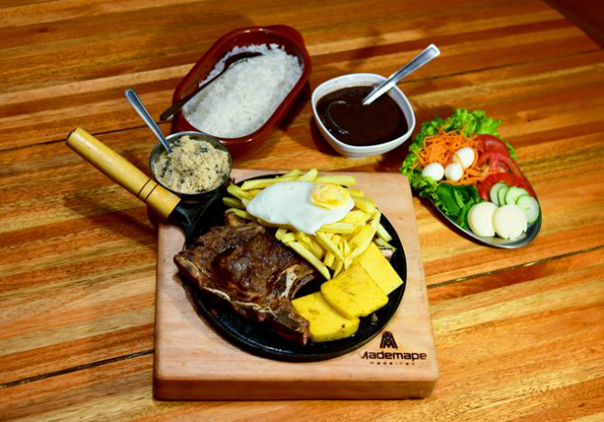 Restaurante Dona Julia: Chuleta à Dona Julia, contrafilé com osso servido em chapa aquecida, acompanhado de polenta grelhada na chapa, batata frita e ovo.