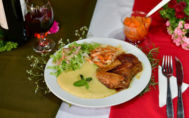 Pastaciutta Restaurante e Pizzaria: Frango Caipira orgânico com Polenta, com uma taça de vinho e sobremesa – doce de abóbora artesanal.