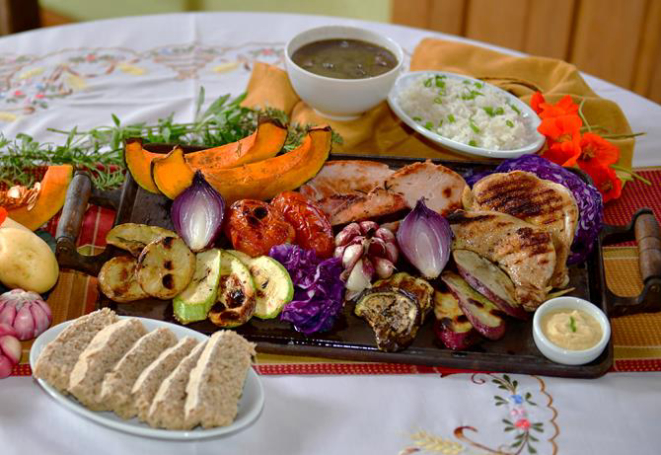 Portal do Itupava: Tábua Rústica Anhangava, para duas pessoas. Legumes feitos na brasa com pernil e frango grelhados. Na versão vegetariana, serve homus, caponata, ricota temperada e pão de fermentação natural com guarnições de arroz e feijão.