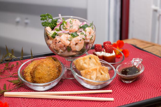 Saori Sushi Truck: Ceviche do Saori, com berinjela recheada com nirá e guiosa com molho especial de entrada e ceviche misto com salmão e camarão.