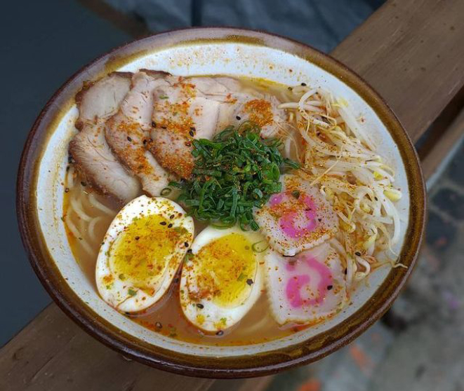 Um dos mais tradicionais é o Missô Lamen, com caldo-base temperado com missô, macarrão e, de topping, chashu (fatia de carne de porco enrolada), ovo cozido, broto de feijão, cebolinha, alga nori e narutomaki (aquela massa de peixe, também conhecida como kamaboko). Há ainda versões como o Chili Lamen, Butter Corn Lamen, Chicken Lamen e Vegetariano Coconut. O menu também tem opções de porções, como a de gyosas de carne (R$ 23,90) ou cogumelos (R$ 26,90). O delivery tem entrega própria via telefone, além dos aplicativos.