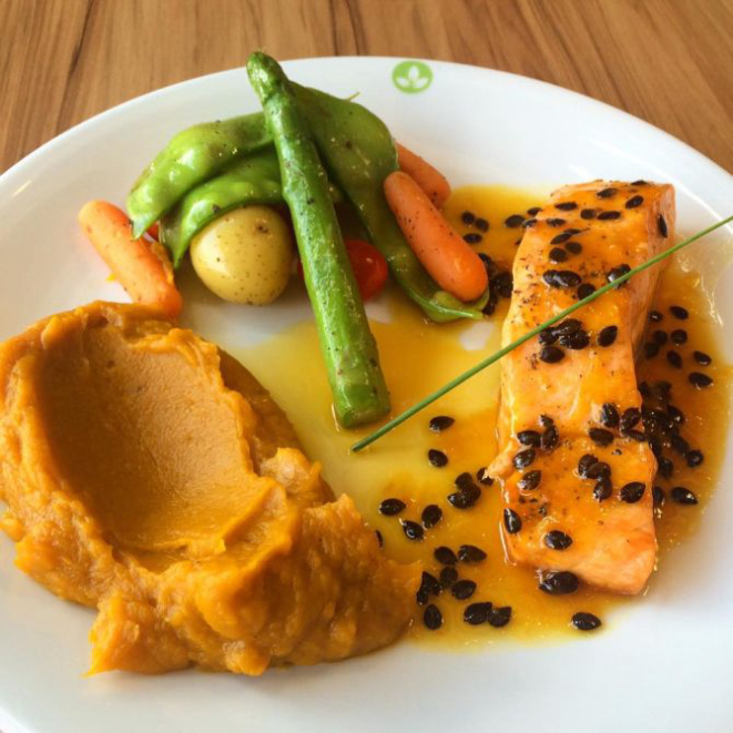 Salmão com molho maracujá, purê de abóbora e legumes é um dos pratos do cardápio. Foto: reprodução Facebook