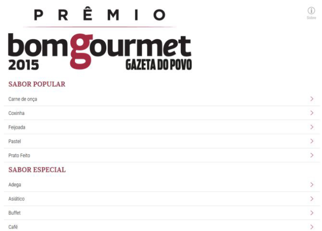 Os mais de 130 espaços que constam no guia, todos localizados em Curitiba, foram indicados pelos jurados do Prêmio Bom Gourmet 2015, que ajudaram a eleger os vencedores baseado em suas experiências. E há sugestão para todos os gostos e paladares, de comidas consagradas pelo gosto popular – o público elegeu o melhor pastel, carne de onça, feijoada, coxinha e prato feito – a iguarias elaboradas pelos melhores chefs da cidade. Também há informações no aplicativo sobre os melhores chefs da cidade no Chefs 5 Estrelas e também sobre os restaurantes que eles comandam.