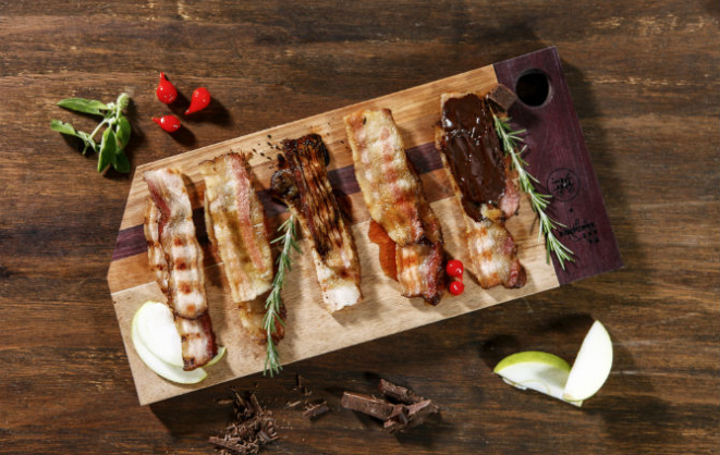 Enquanto a porção de bacon é composta por pedaços menores do corte, fritos em imersão (R$ 14), o Cinco Tons de Bacon (R$ 19) vem com fatias dispostas em uma tábua, sendo duas unidades de cada uma das versões. Todas elas são feitas na grelha e servidas com seus complementos – apenas a defumada em madeira de macieira vem pura.