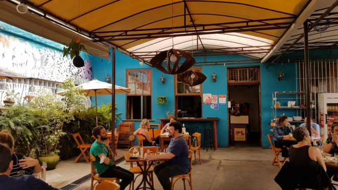 A fachada em tom azul claro esconde um quintal cheio de plantas e com mesinhas espalhadas em uma área aberta e sombreada. Os pratos variam conforme o dia da semana. O carro-chefe da casa, no entanto, é o brasileiríssimo prato feito.