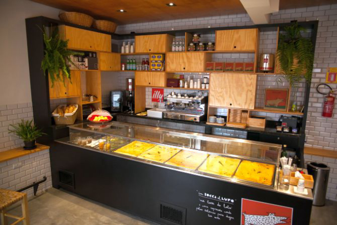 O ambiente é despojado, tem mesas para quem quer fazer uma refeição rápida e um balcão equipado com a estufa de vidro, onde ficam expostas as focaccias. Em média, novos sabores saem quentinhos do forno a cada duas horas. O nome do estabelecimento vem da expressão italiana “in bocca al lupo” (literalmente, na boca do lobo), que significa um desejo de boa sorte.