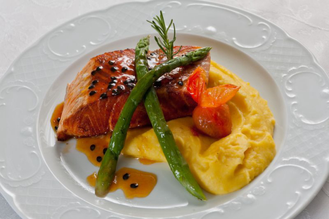 Durante o mês de julho, o Hotel Bourbon Curitiba terá no jantar, a um preço fixo, um cardápio elaborado com pratos da cozinha contemporânea e influência francesa. Destaque para o salmão grelhado na manteiga de limão siciliano com ciboulette, mousseline de mandioquinha e mix de vegetais (foto).
