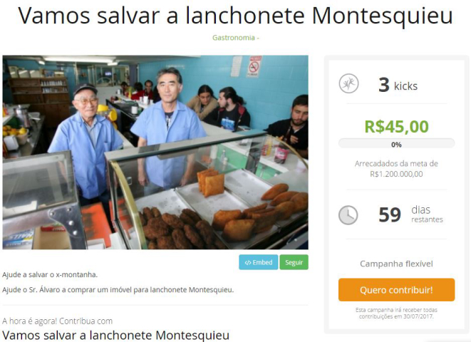 A meta é chegar a R$ 1,2 milhão, valor que ajudará o proprietário do local, Álvaro Ota, a comprar um novo imóvel para a lanchonete. Até o fechamento desta reportagem, haviam sido arrecadados R$ 45. “Se cada um comprar um x-montanha ‘virtual’, que custa R$ 14,90, a gente consegue o valor da meta com 80 mil pessoas”, calcula Fernandez.