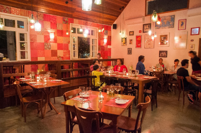 Para inspirar as refeições afetivas, a casa criou um ambiente de muito bom gosto: sem ser pomposo, tampouco exageradamente informal. Mesas em madeira, papel com tons de vermelho, lustres feitos de garrafas e taças, e muitas flores dão um toque de charme – e de romantismo, diga-se – ao bistrô. São 70 lugares divididos em dois ambientes: um deles com um deque elevado perto das janelas e um sofazinho de canto; outro com teto de vidro e jardim de inverno.