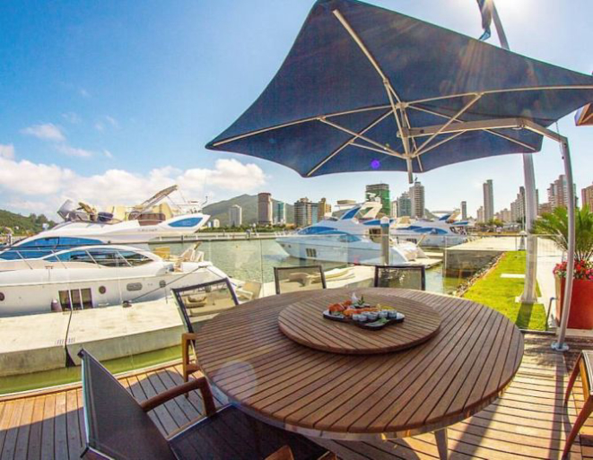Com vista para o mar e para os iates ancorados a poucos metros da praia, o restaurante aposta na vasta diversidade de frutos do mar, além das opções da cozinha nikkei, inspirada na culinária japonesa e peruana, raridade no litoral catarinense.