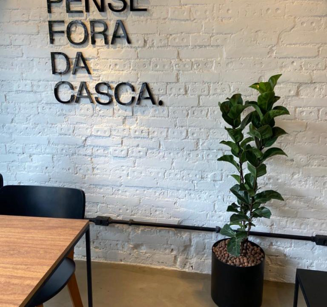No térreo, chama atenção a cozinha aberta, que escancara toda a dinâmica do coração do Eggs. "Dividimos o espaço inferior para refeições mais rápidas, por isso o uso das baquetas e mesas altas. Já na parte superior, a ideia é que as pessoas possam permanecer mais, com direito a tomadas para conectar notebooks e até uma mesa grande, que pode eventualmente, ser usada para reunião", explica. Há, ainda, um cantinho com um sofá e mesinhas mais baixas, que também serve para um bate-papo mais reservado, e uma pequena área livre, que pode ser usada nos dias menos chuva.
