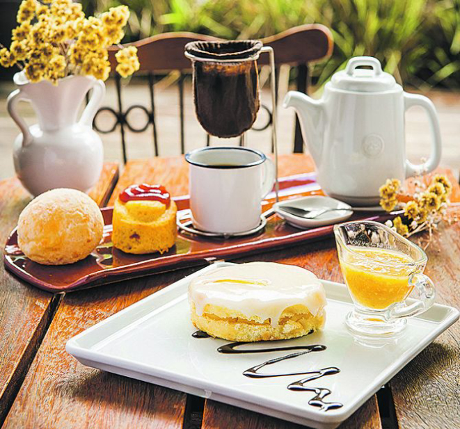 Junto à loja está o café com opções para todos os horários. Entre as consagradas estão os pasteis assados de lombo com damasco e peito de peru (R$ 12) como os mais pedidos, e na parte de doces, destaque para o cuque de leite Ninho (R$ 12), e os bolos desconstruídos na taça (R$ 12), todos servidos em monoporções. Os bolos servidos no café podem ser encomendados em tamanho grande para comemorações. A casa pede de dez a sete dias antecedência.