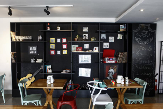 Com móveis coloridos e mesas de madeira o ambiente tem uma pegada lúdica, que fica ainda mais forte com os brinquedinhos presentes em todas as mesas, um mimo extra para entreter os clientes. Na parede principal, uma estante exibe trabalhos de artistas locais, livros lançados na casa e um violão (para quem quiser tocar), além de uma vitrola com diversos discos antigos e mantinhas para aquecer as noites de inverno.