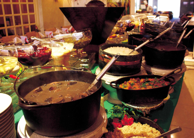 O buffet tem ainda a galinhada mineira, que leva coxa e sobre coxa de frango temperado, pimentões, quiabo, concassé de tomates, arroz, açafrão e cheiro verde, além das entradas e buffet de sobremesas.