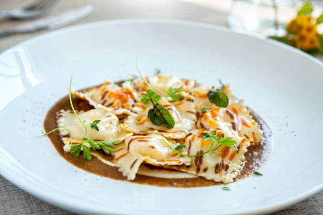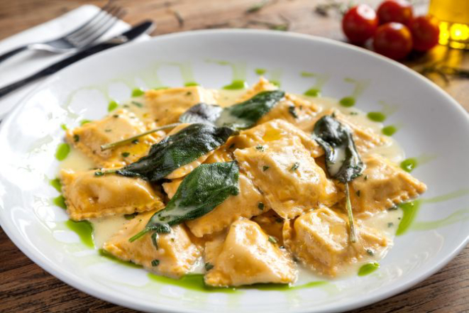 O Ravióli di zucca aromático — ravióli de abóbora-menina artesanal salteado na manteiga e aromatizado com sálvia — é a opção de prato principal do almoço de R$ 49,90 que leva massa. Veja o endereço.