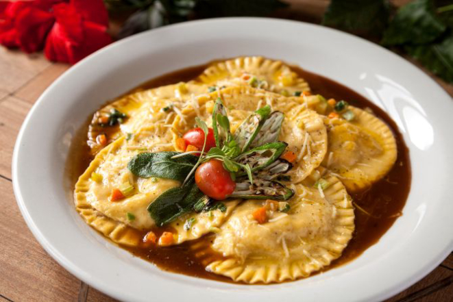 A massa fresca recheada com brie e pera ao molho jus de funghi está no menu do almoço da casa, por R$ 39,90. Confira o jantar.