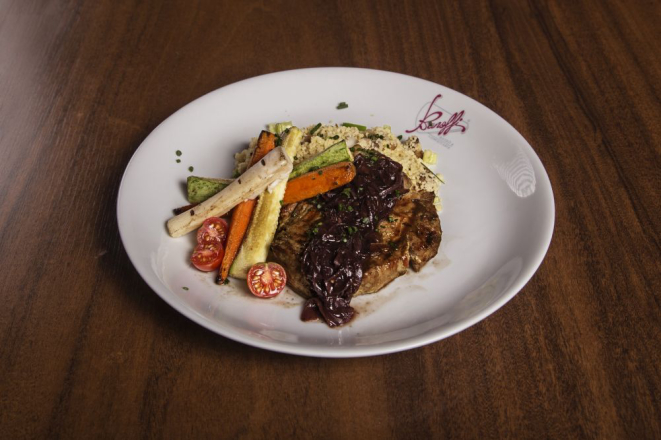 Lombo com molho de cebola ao vinho tinto, cuscuz marroquino com cogumelo e alho-poró e legumes na manteiga