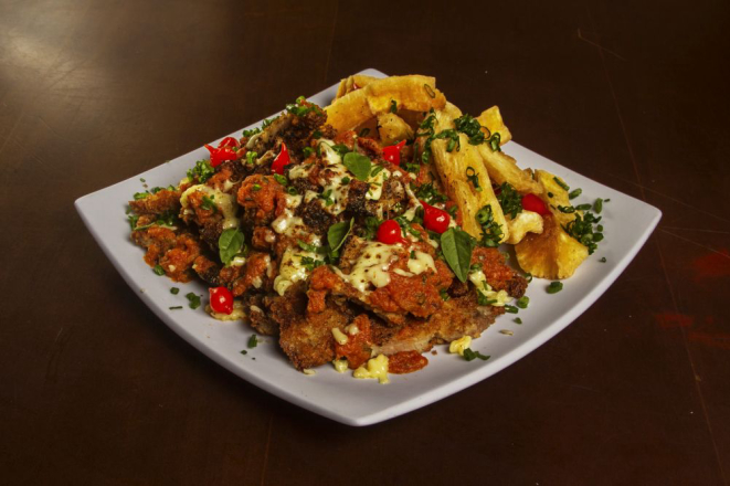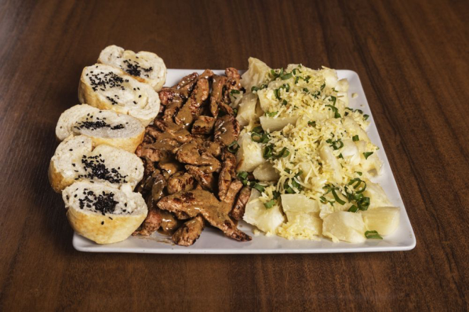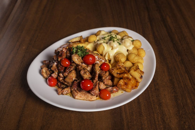 Copa lombo com aligot (purê de batata) três queijos, farofa de banana e bacon e molho picante