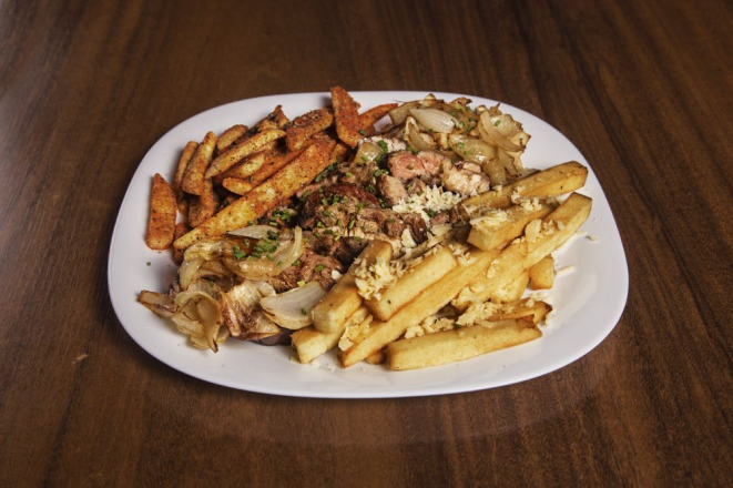 Copa lombo com cebola, farofa, polenta frita e batata frita